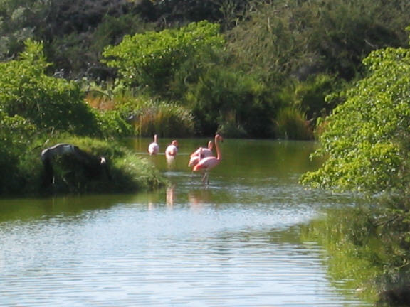 The flamingo with its head under water is feeding. It scoops up mud from the bottom, filtering out the food from the mud with baleen, the same filter system some whales have. Just beyond this area here is a stark lava landscape. All this vegetation is on the very edges of it. It is brackish water, which is what flamingoes require. The water has been higher--you can see the salt encrustation on the vegetation. There are now 830 flamingos throughout islands, up from 600 several years ago. This is an effect of El Nino, which brings huge amounts of rain, and brings in warmer waters from a change in current. The warmer waters cut off the flow of nutrients from the cold deep-sea waters, so El Nino drastically cuts back marine life. Since there's a drop in the number of fish to eat, seabirds and sea lions have a population crash during El Nino years. But it's a huge boon to land creatures since they get lots of water in the form of rain, which allows the vegetation to grow and gives them more food to eat. Their populations rise, as we can see in the change in the number of flamingoes. |