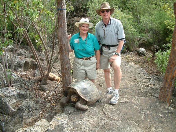 When we visited a corral with all female tortoises from various islands, SOMEBODY in our group suggested that we get a picture of "the girls and the girls." (Hint: She's wearing a green Probe shirt and smiling at the camera.) The ladies weren't concerned about the tortoises running away. As Darwin wrote, "The inhabitants from observing marked individuals, consider that they travel a distance of about eight miles in two or three days. One large tortoise, which I watched, walked at a rate of sixty yards in ten minutes, that is 360 yards in the hour, or four miles a day." |