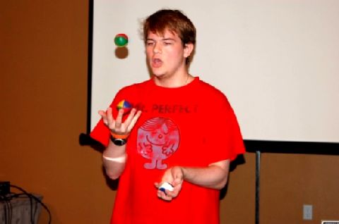 Austin Grey juggled and mimed and portrayed a ventriloquist. |