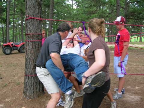 Josh Looney is passed by his group through the “poisonous” spider web. |