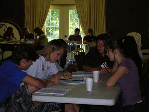 ![]() The girls--Rachel Smoot, Lydia Arrington, Kathryn Jones, Heather Frey, Erin Singleton, and Britney Bearden--roll up together for the low ropes course. The students were divided up into their reading groups, together facing the problem-solving challenges of the different elements of the course. This is the first year the Ozark staff provided this opportunity for the students to get to know each other and bond with each other so early in the week, and we are grateful for what a difference it's making. |
